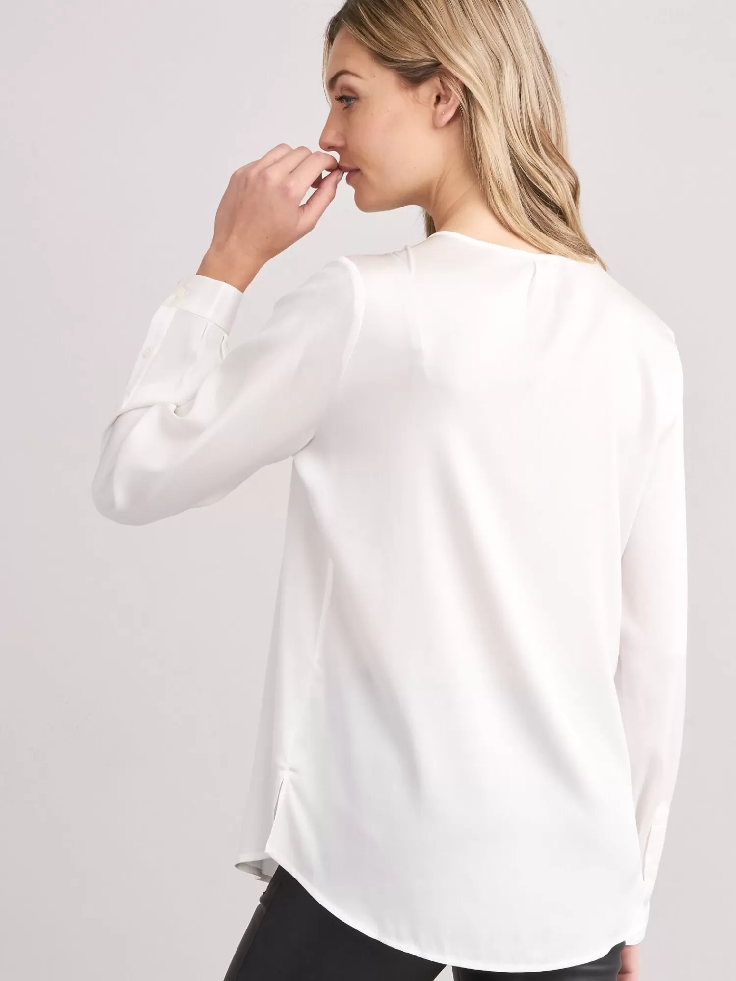 Soepele, elastische zijdeRonde hals met splitjeLange mouwen met manchetBlinde knoopsluitingRecht model blouseLoose fitOp…
