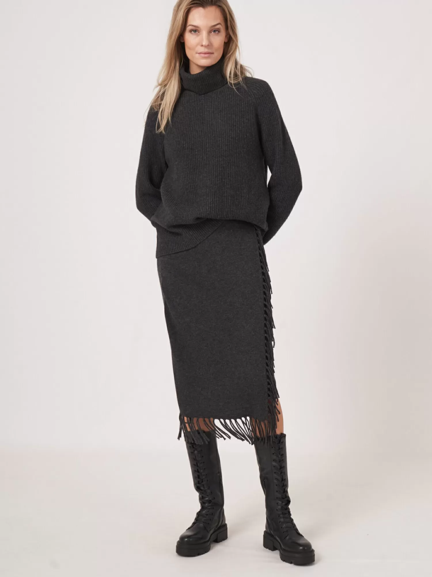 Be the first to review “REPEAT cashmere Jurken En Rokken*Gebreide rok met franjes van cashmere mix Charcoal” Reactie annuleren