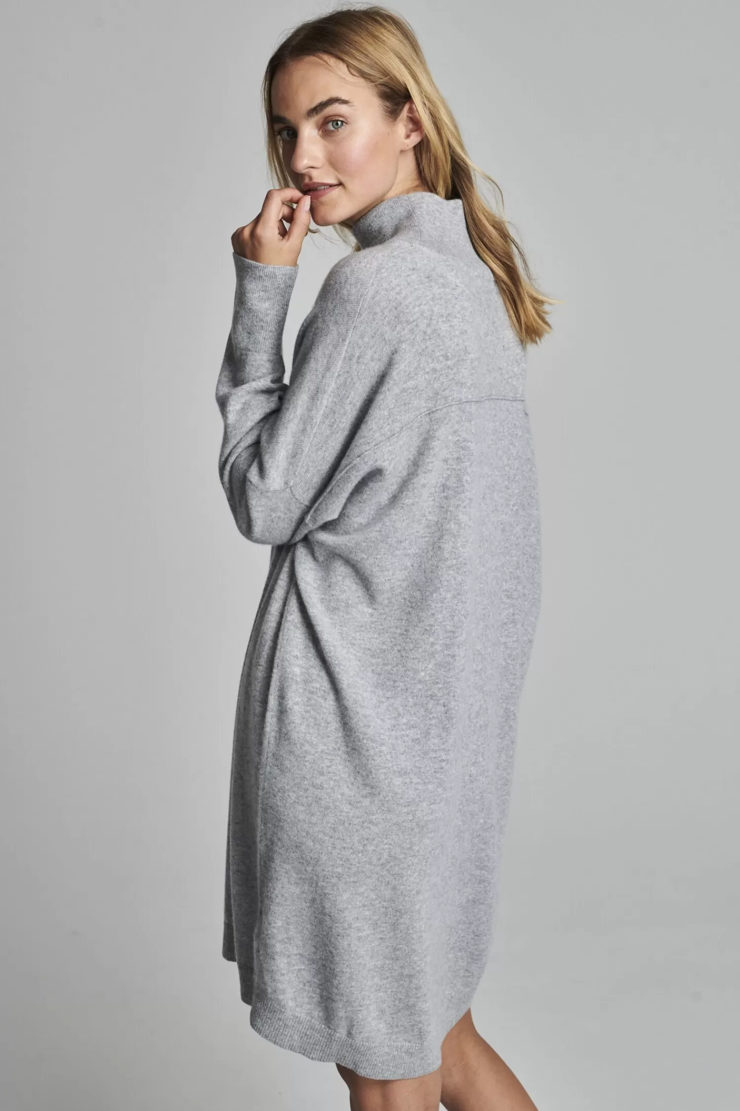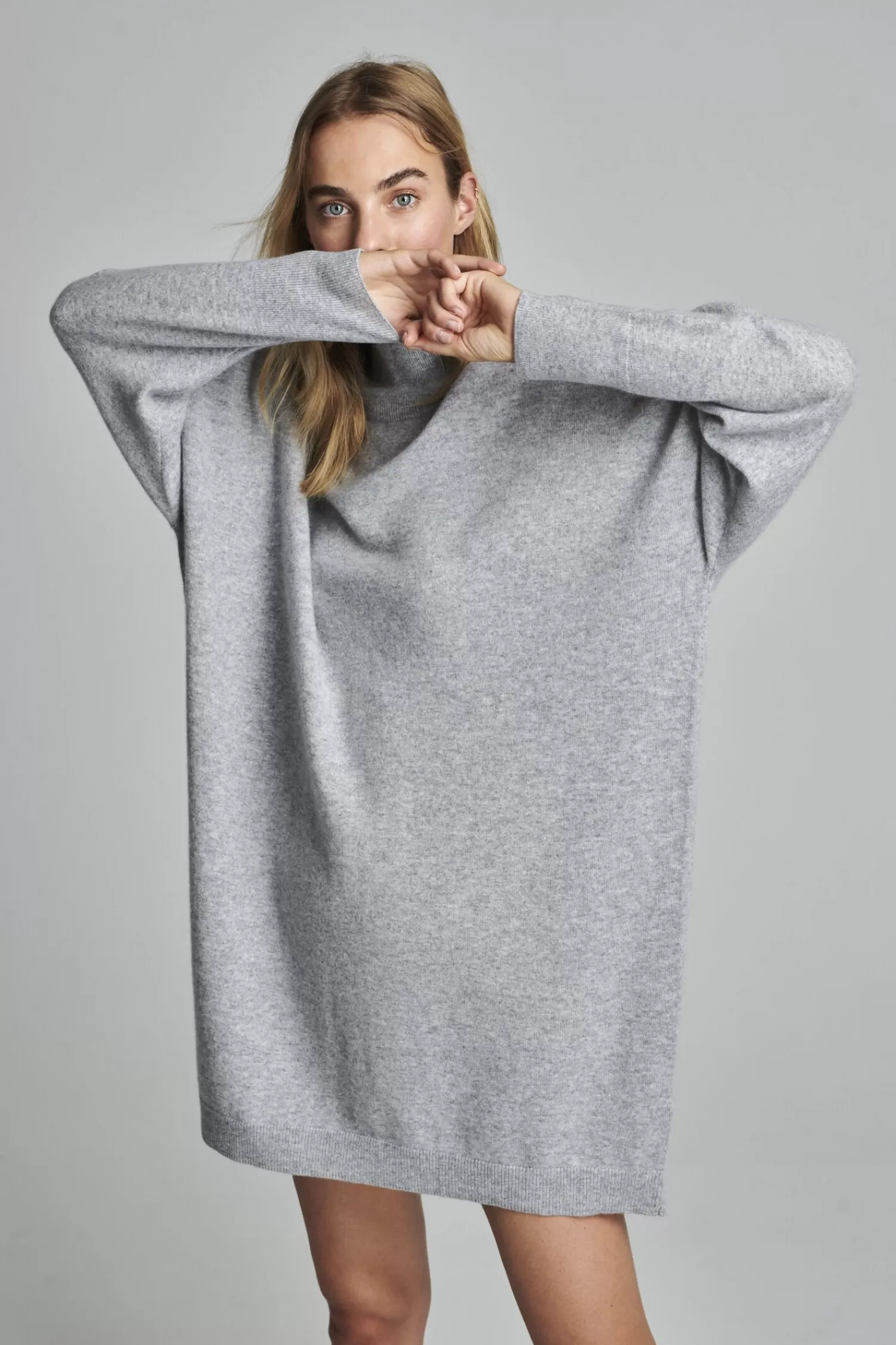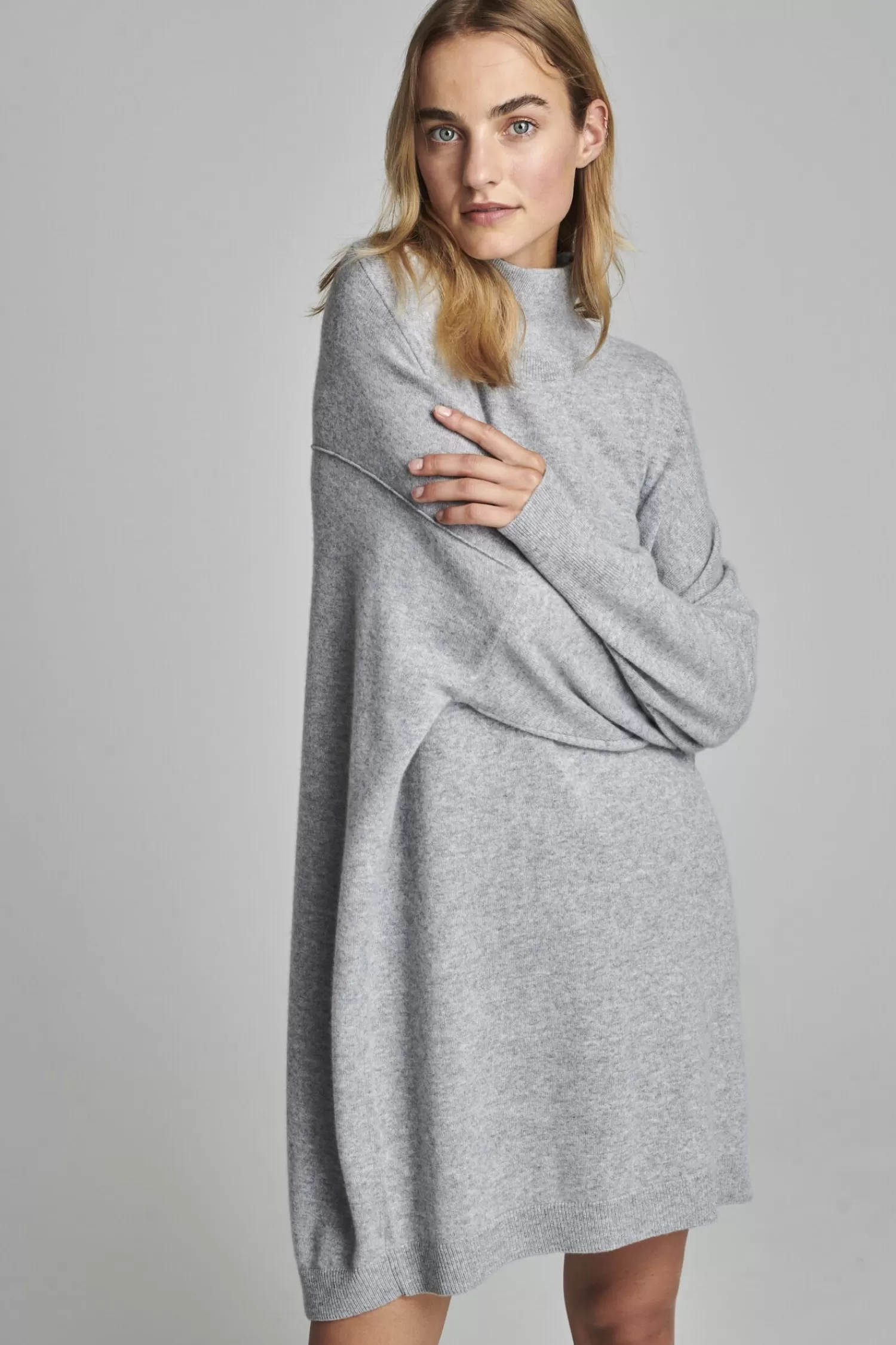 Fijn gebreidOrganisch cashmere GOTS gecertificeerdOpstaande kraagLange mouwRibboordenRecht gebreide jurkLang modelAfhang…