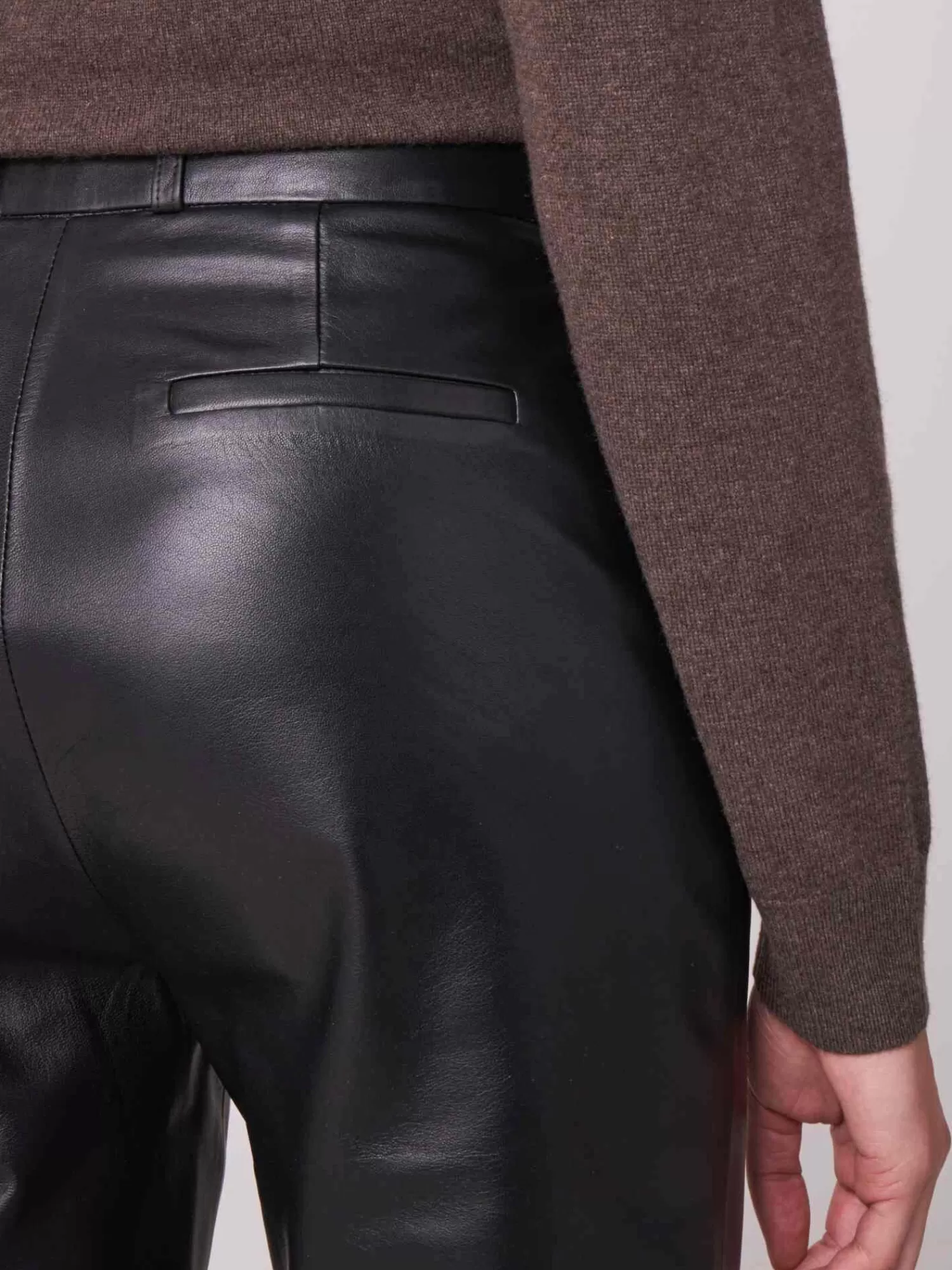 Echt leerBlinde ritssluiting met haaksluitingAansluitende snit met brede broekspijpZijzakken en nepzakken achterRiemluss…