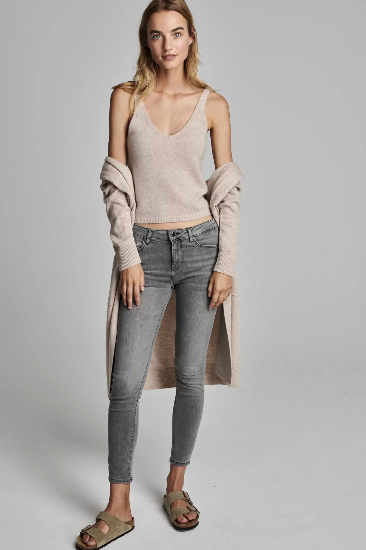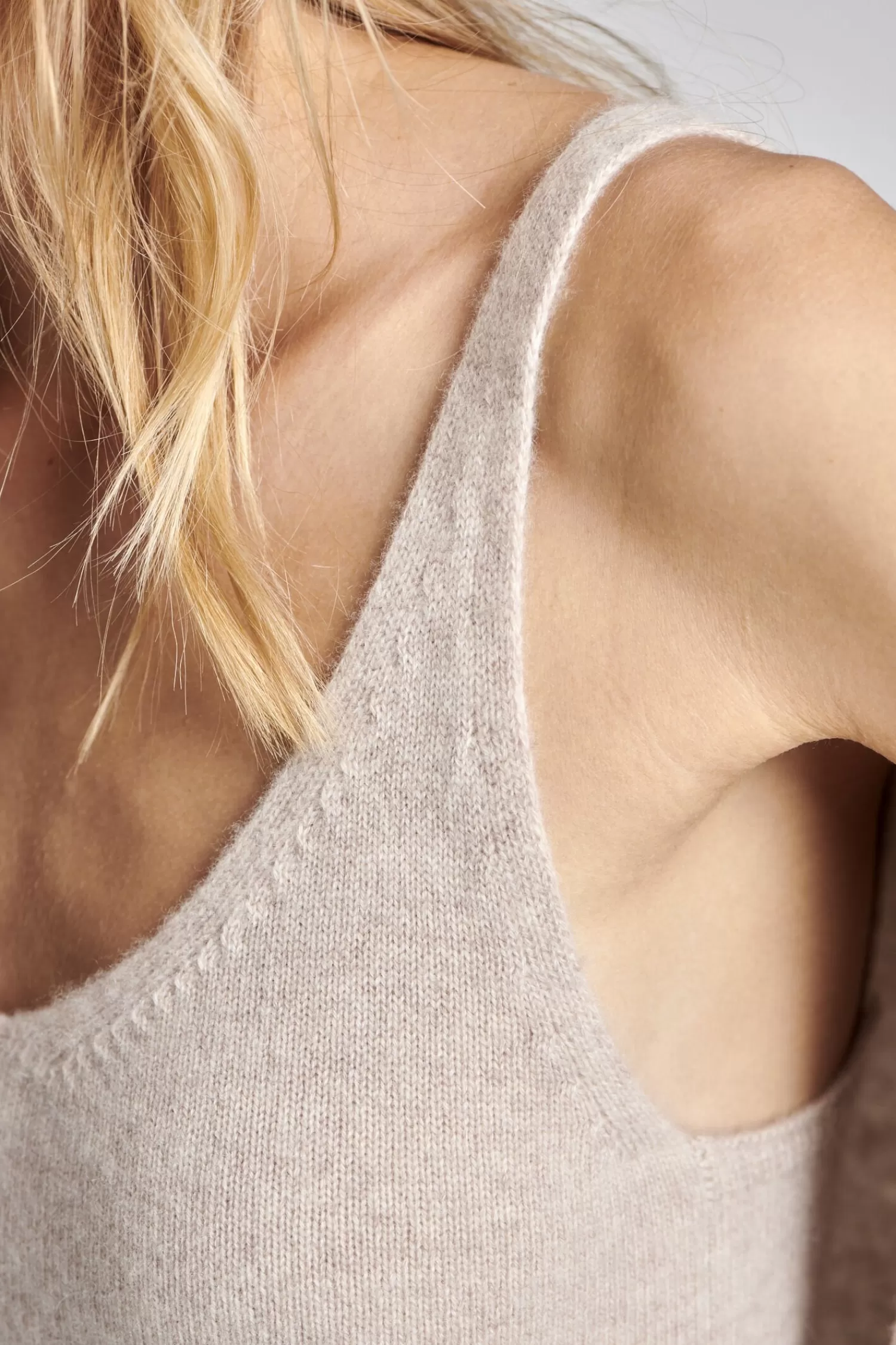 Middelzwaar breiselOrganisch cashmere GOTS gecertificeerdV-hals voor en achterRibboordenCropped cut tank topExtra kort m…