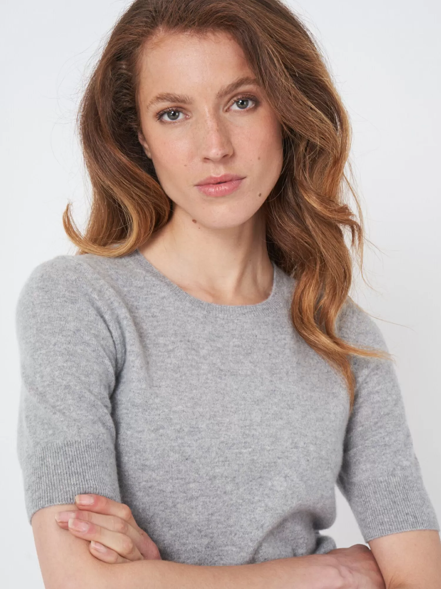 Fijn gebreidOrganisch cashmere GOTS gecertificeerdRonde hals met geribde boordKorte mouwen met ribboordRechtgebreide tru…