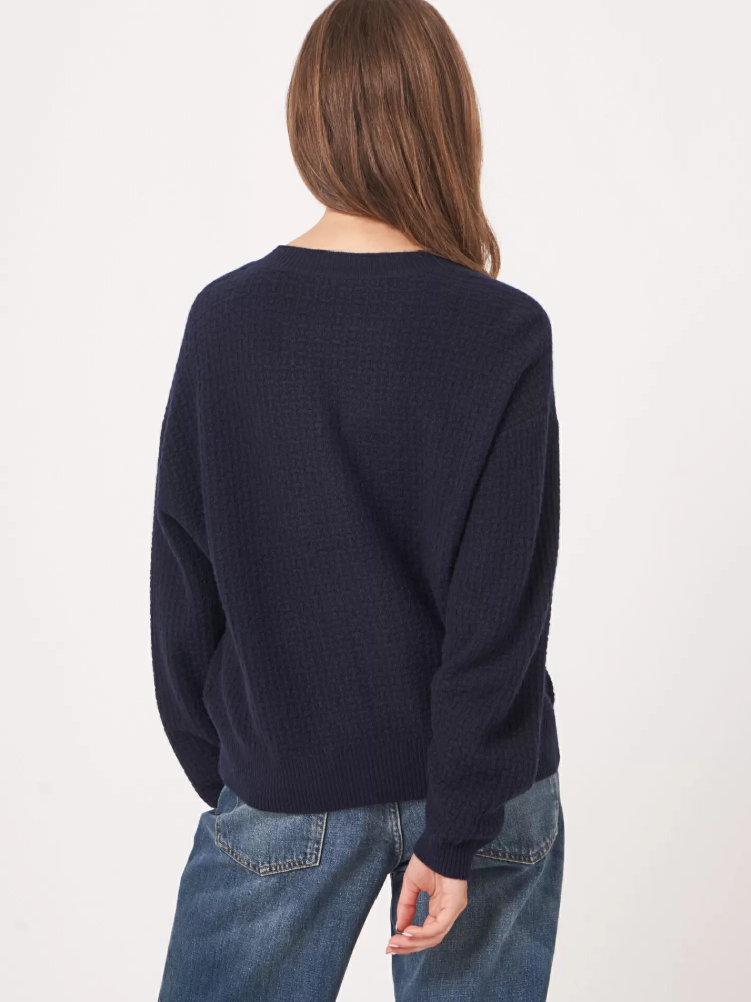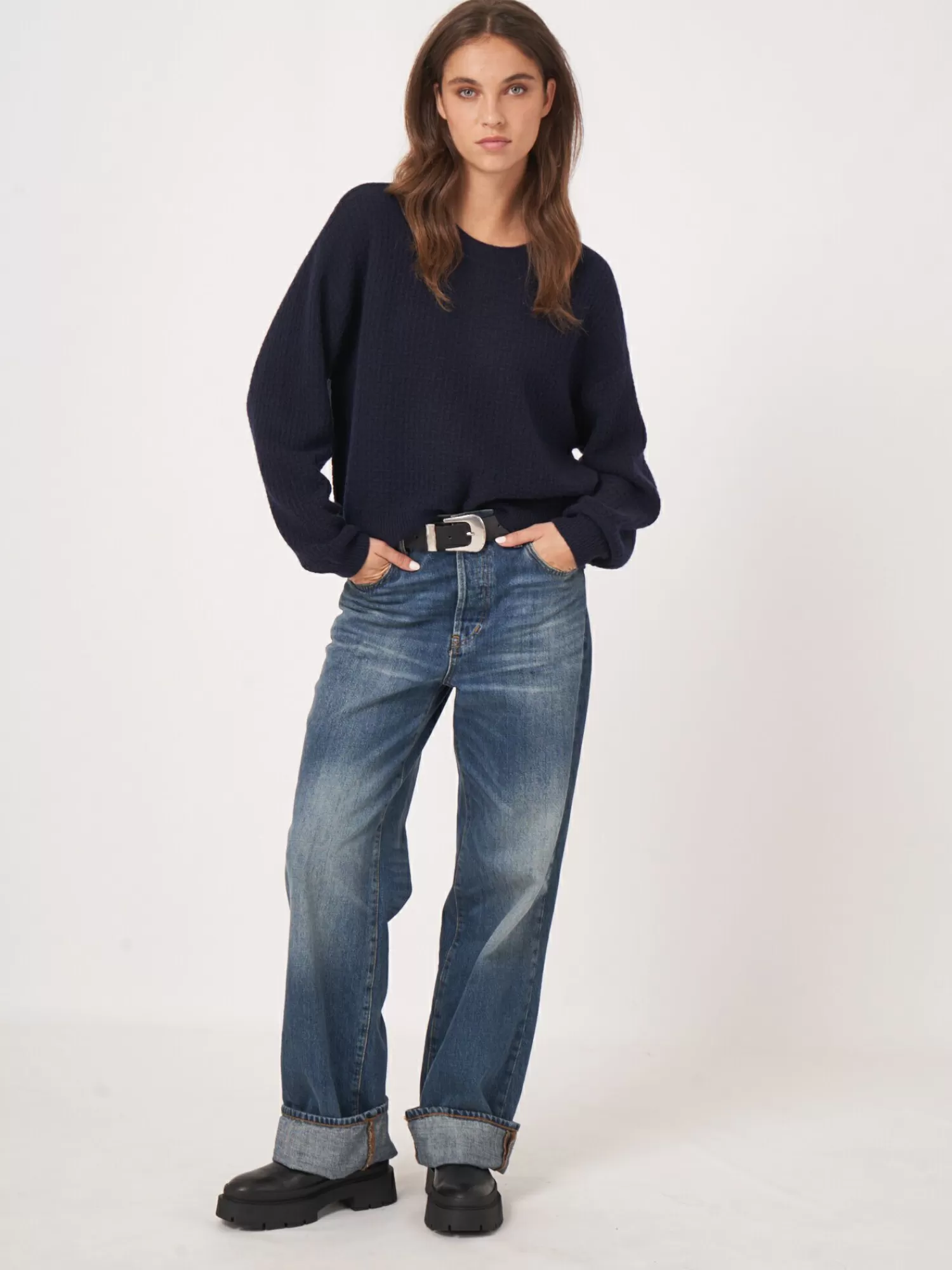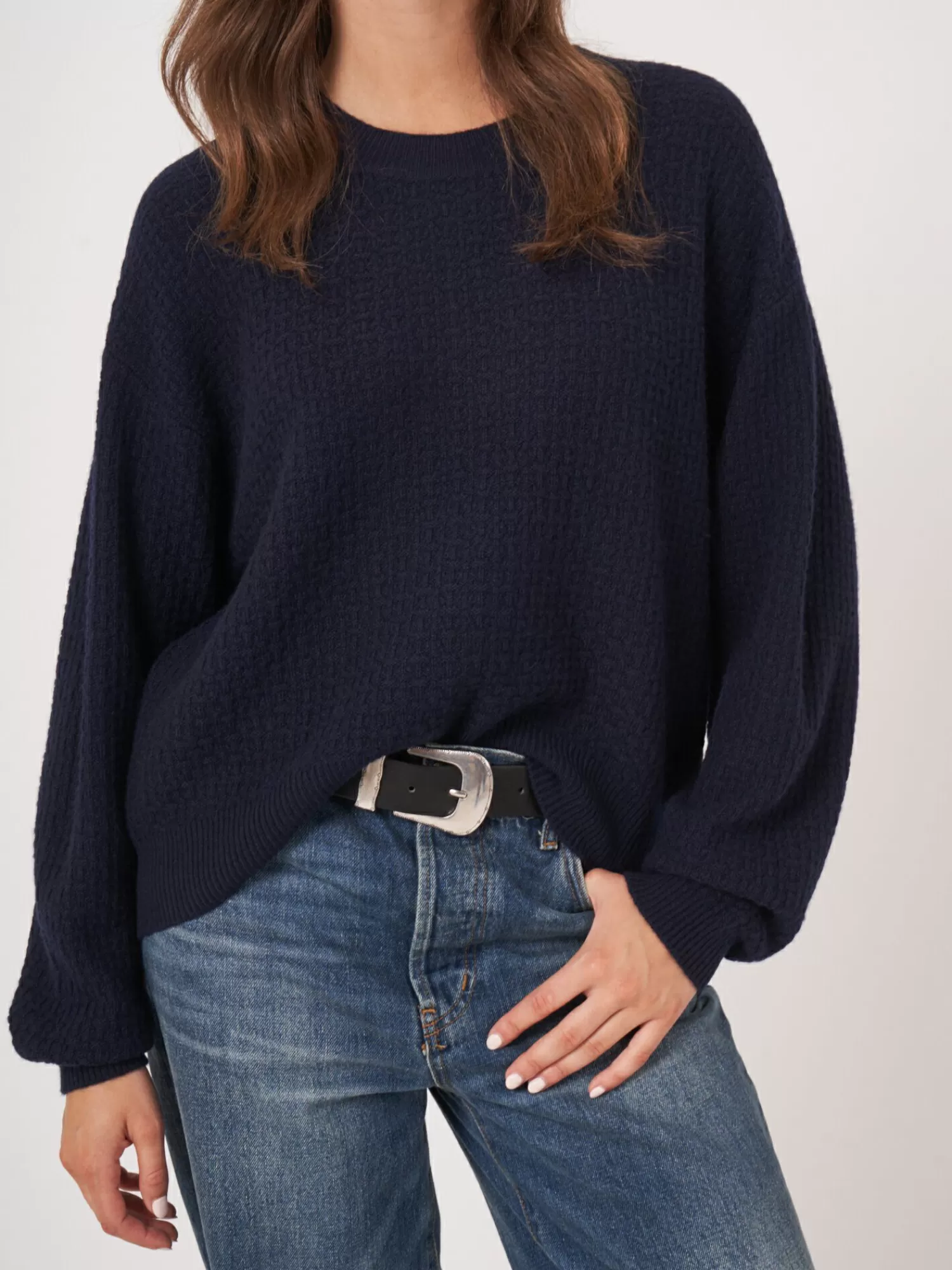 REPEAT cashmere Truien | Organic Cashmere*Ronde hals cashmere trui met structuur en wijde mouwen Navy