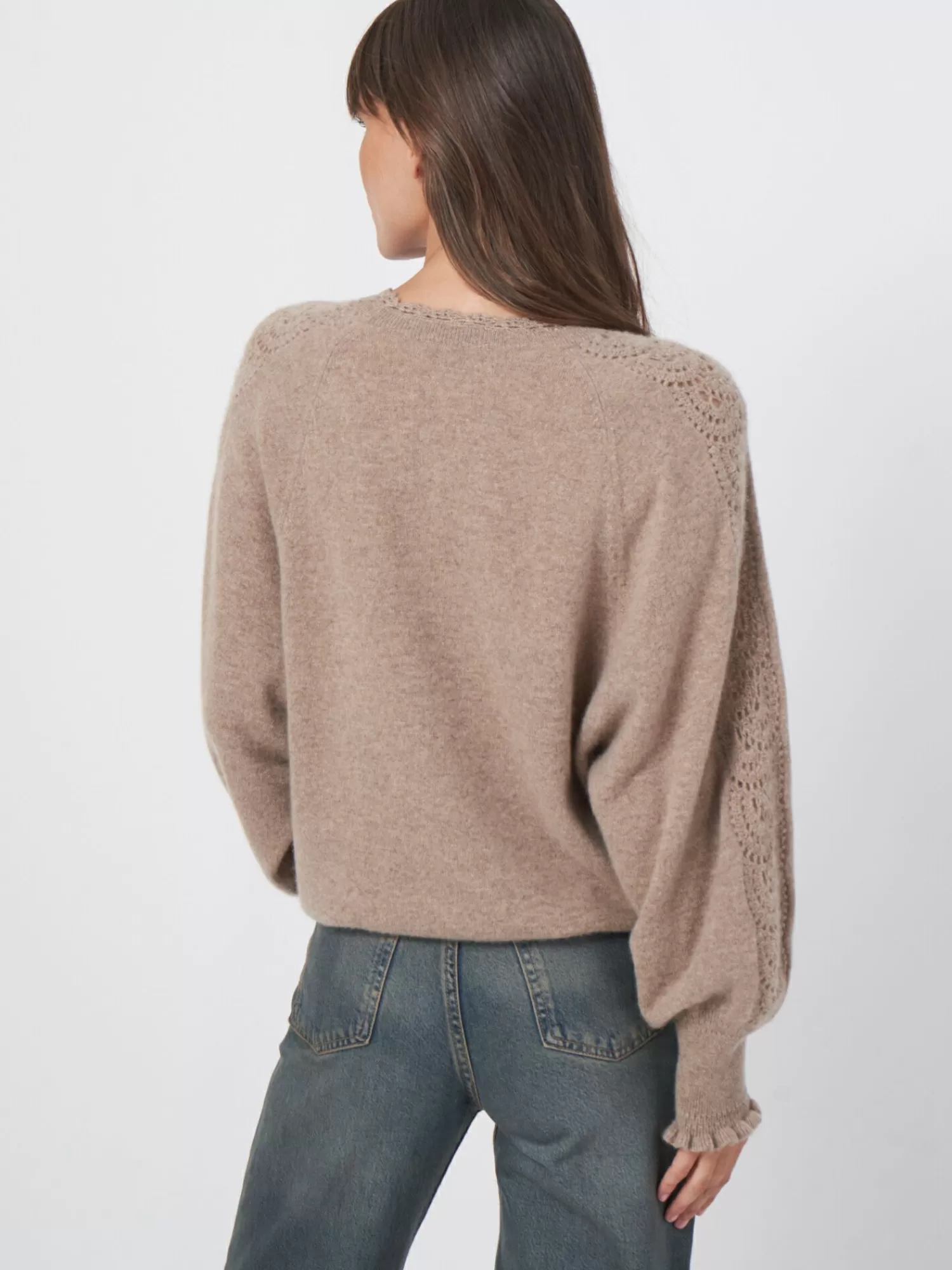 Licht breiselBiologisch cashmere GOTS gecertificeerdRonde halslijn met gehaakte detailsLange raglan pofmouwen met gehaak…