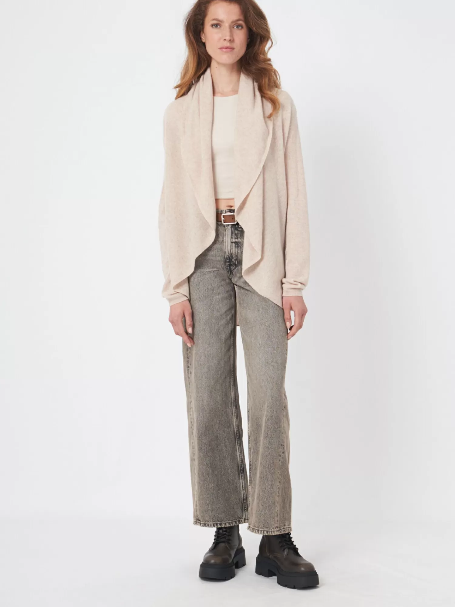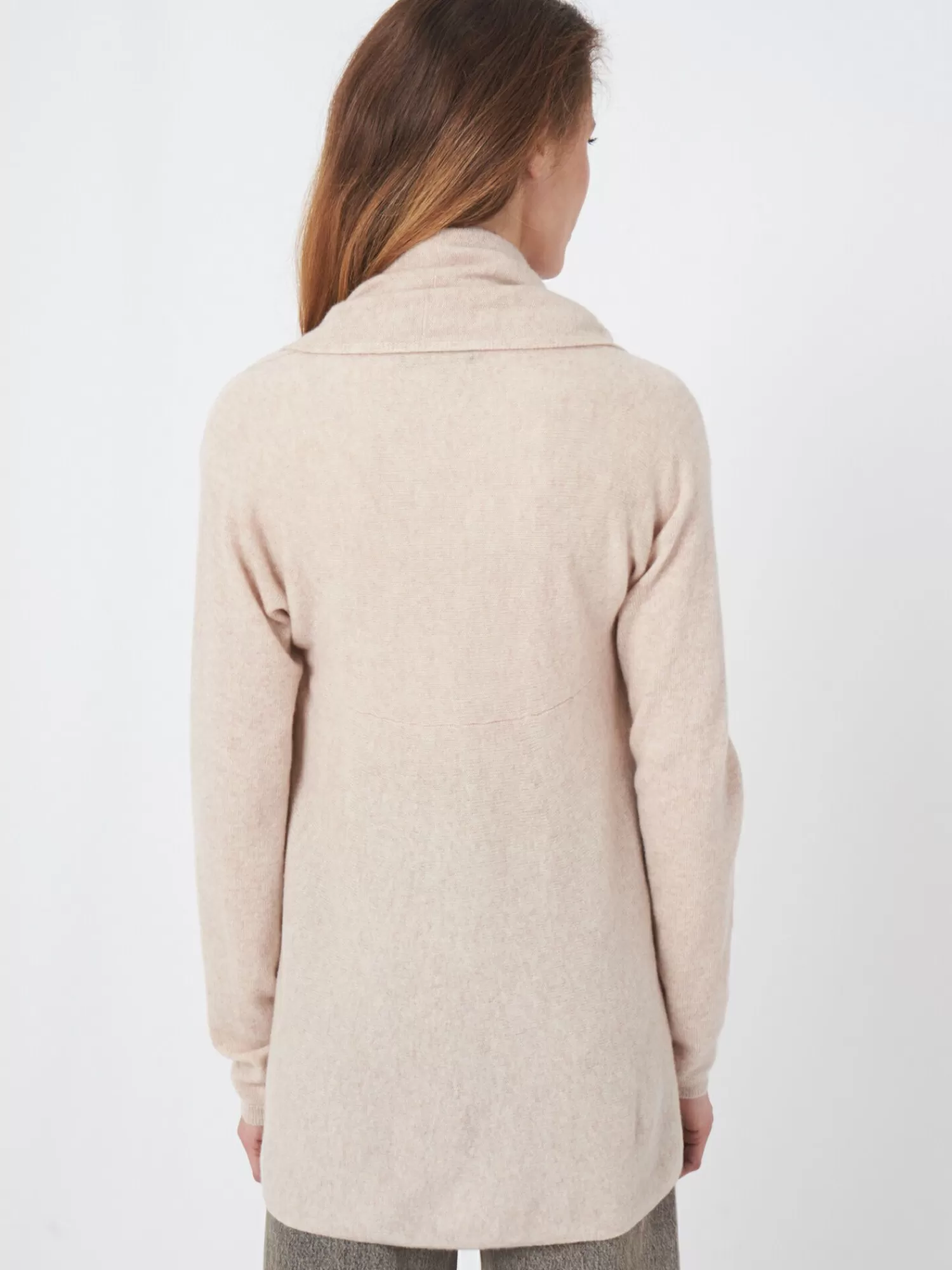 Licht, zacht breiselOrganisch cashmere GOTS gecertificeerdSjaalkraagLange mouwenRibboordenOpen voorzijderond gebreid ves…