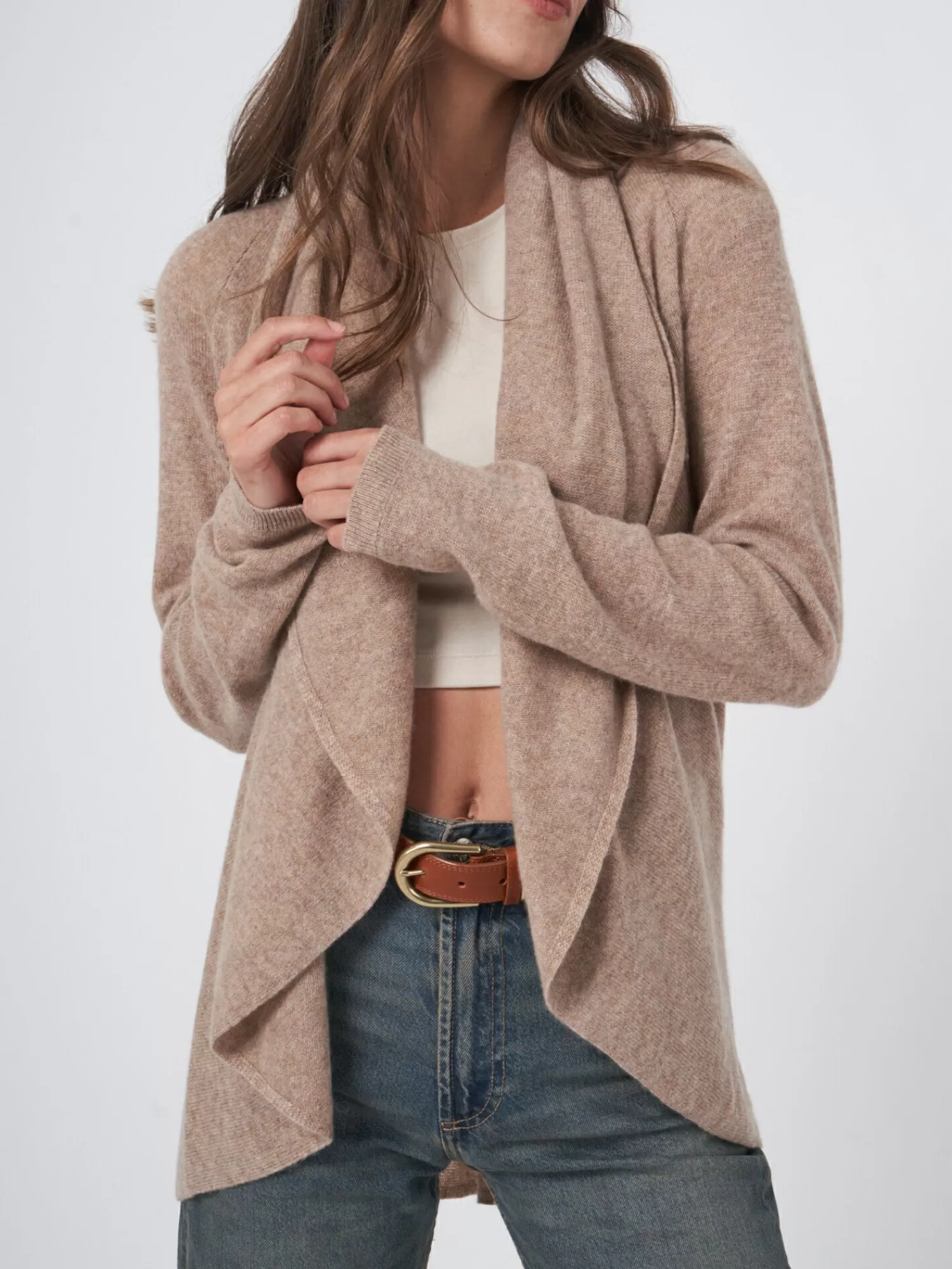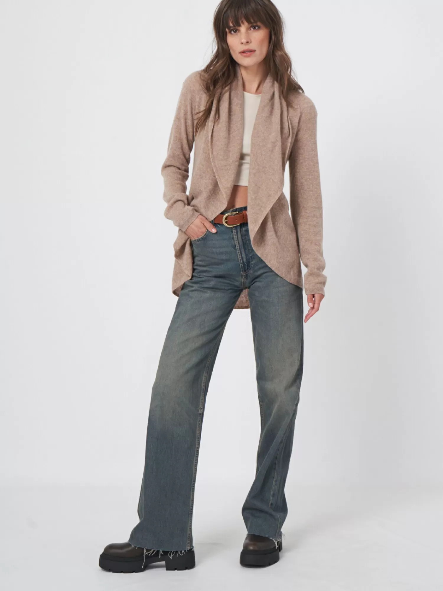 Licht, zacht breiselOrganisch cashmere GOTS gecertificeerdSjaalkraagLange mouwenRibboordenOpen voorzijderond gebreid ves…