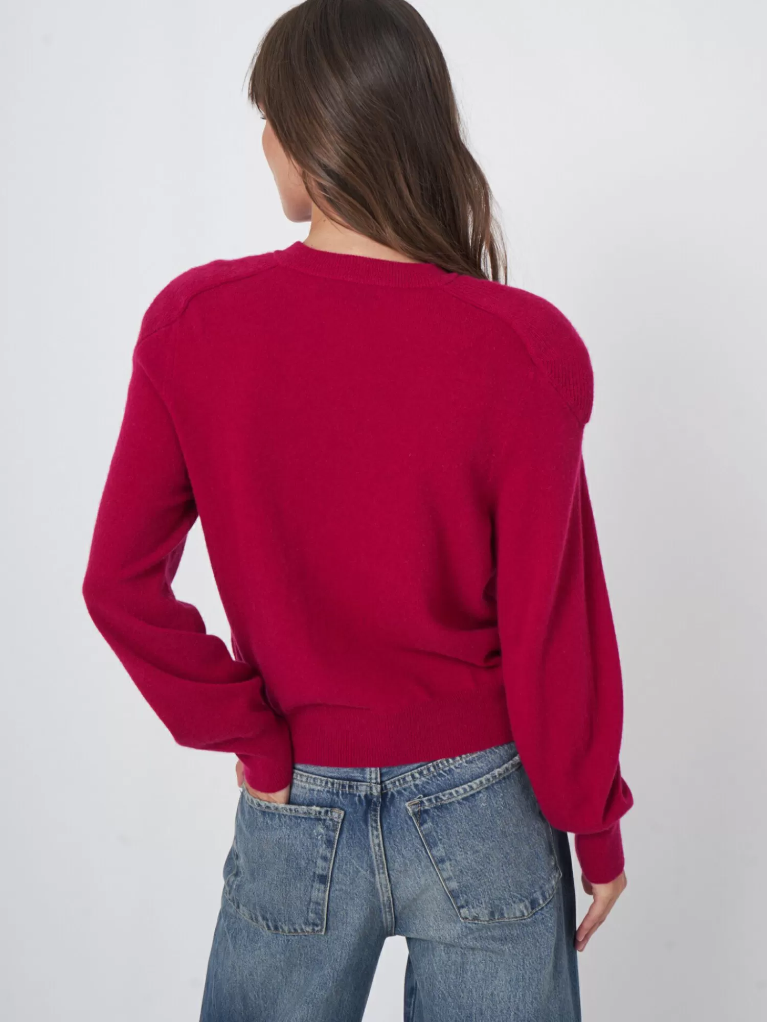 Licht fijngebreidBiologisch cashmere GOTS gecertificeerdRonde hals met geribde boordLange pofmouwenRibboordenKnoopsluiti…