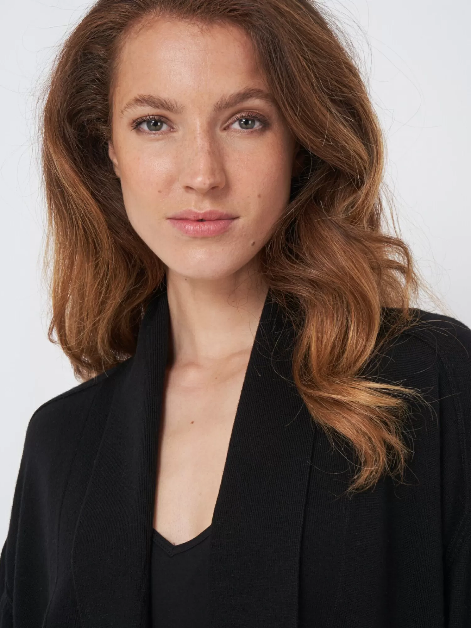 Fijn gebreidHoogwaardige wol-mélangeSjaalkraagLange zadelmouwen met geribde manchetOpen voorzijdeRecht gebreide cardiga…