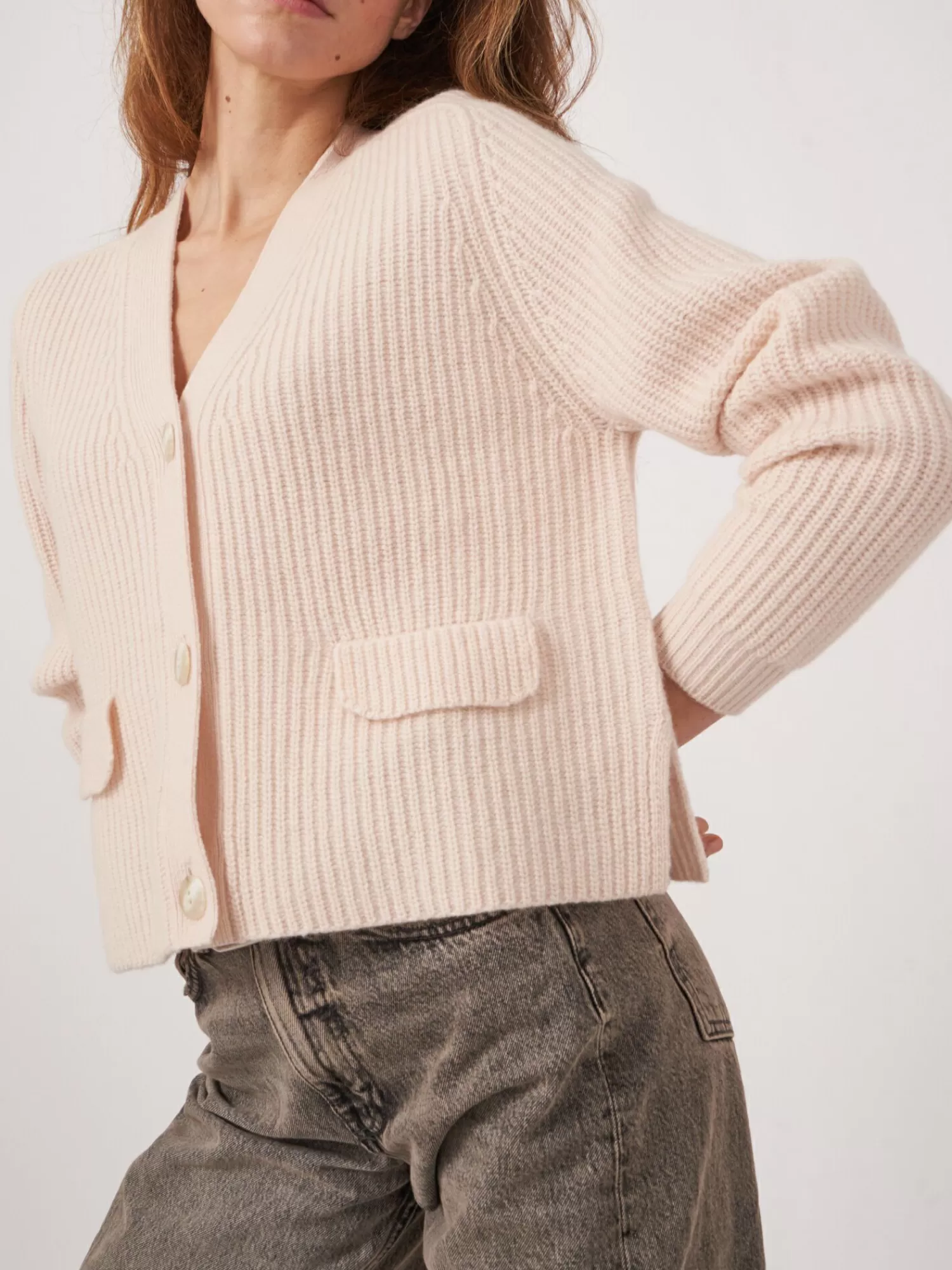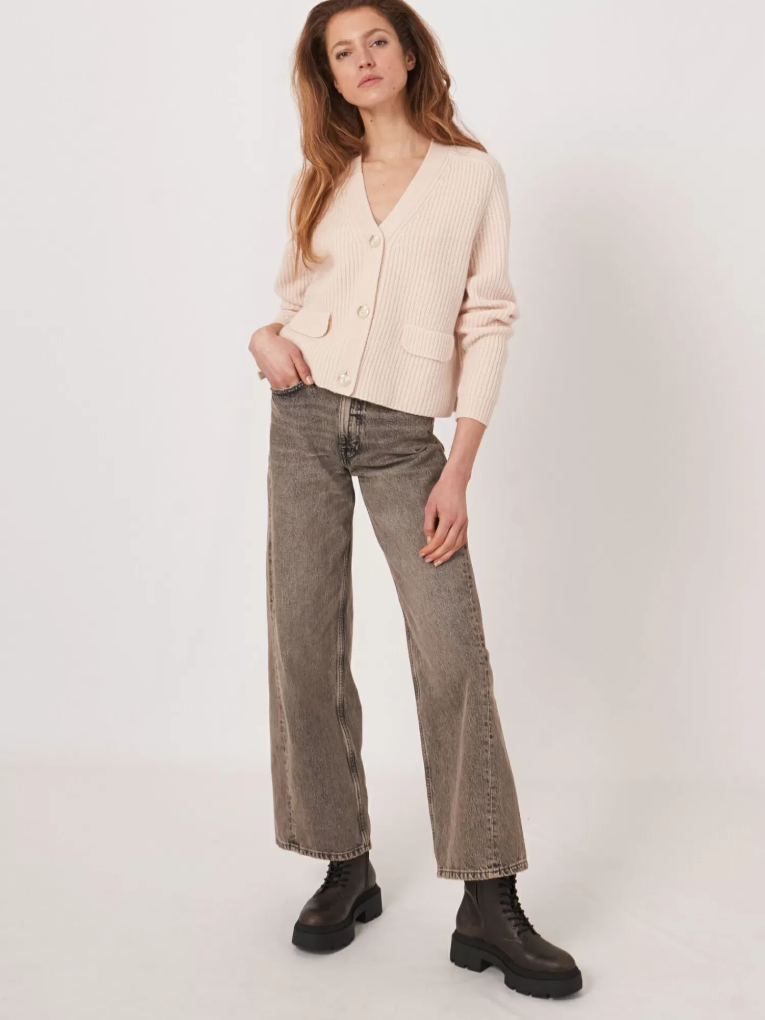 REPEAT cashmere Vesten*Korte ribgebreide cardigan van Italiaanse wol Pearl