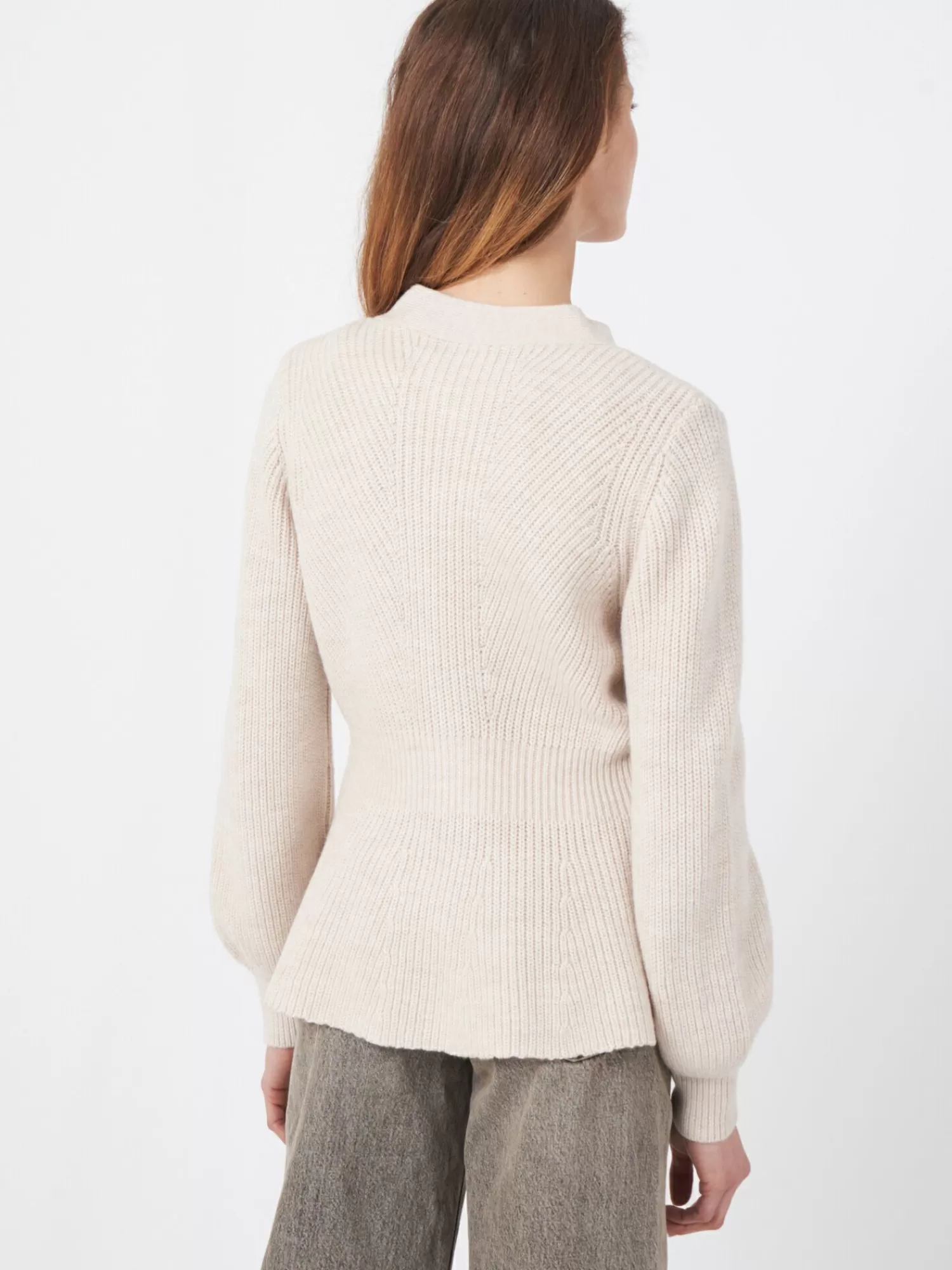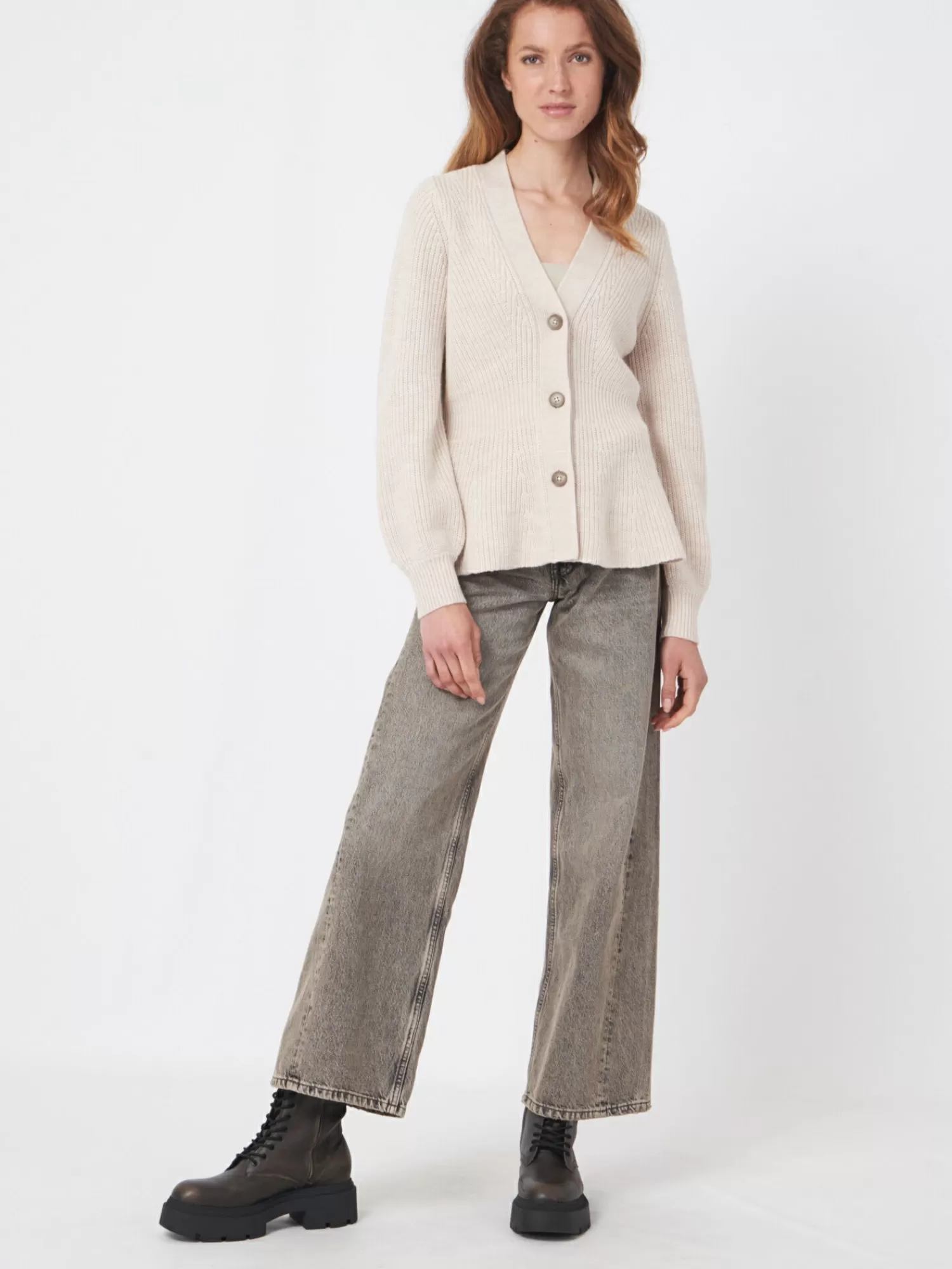 Ribbreisel met richtingsveranderingExtra fijne merinowolKnopenlijst met V-halsLange geribbelde pofmouwenRibboordenKnoops…